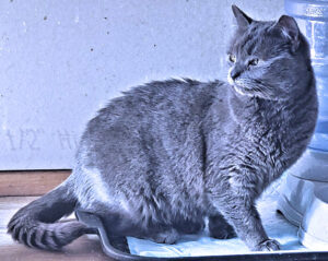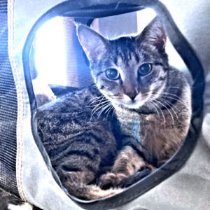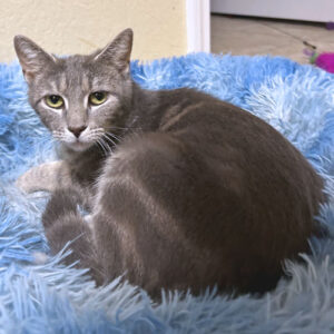 Carly is a spayed female gray cat, born in December 2024. She was rescued from a large colony of cats that had been abandoned. Carly does have a cloudy left eye which the vet examined and determined she has a very small tear in her third eyelid in the left eye. The cornea is mildly inflamed but appears intact and is not ulcerated. Other than some watery discharge from time to time, the eye does not cause her pain or limit her play time or interaction with foster siblings. She adores being held and petted. …