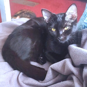Black Velvet is a spayed female black cat, born on May 25, 2025. Black Velvet lives up to her name, long and lean and sleek black fur, with eyes the color of whiskey. She’s playful and affectionate, loves attention and toys. Gets along with other cats, especially her littermate Rusty, and her foster sibs. She’s fully housetrained and a good girl. . Inside cat only! The adoption fee is $50. VS