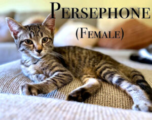Persephone is a spayed female gray tabby, born in August 2025. She is a beauty with mystery in her eyes and grace in her every move. She’s equal parts queen and cuddlebug, the kind of cat who looks like she just stepped out of a myth. She’d thrive in a home that matches her energy: peaceful, loving, and patient enough to let her heart bloom in its own time. A goddess of both light and shadow, Persephone is ready to bring a little magic to your mortal world. Indoor cat only! The adoption fee is $50. JL
