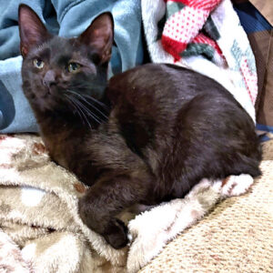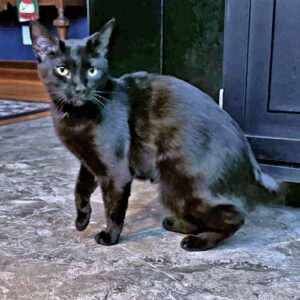 Rusty is a spayed female black-and-brown cat, born on May 25, 2025. Rusty is slim and sleek, curious and playful: loves to cuddle. She’s fully housetrained and a good girl. Inside cat only! The adoption fee is $50. VS