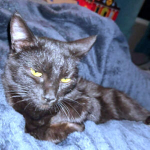 Swifty is a spayed dark grey female cat, born on July 24, 2024. Her fur is velvety soft and there are very faint tabby markings on her dark grey coat. She has dyed chromatic eyes that are a yellow hazel color with a small ring of blue around the pupil. She’s playful and likes curling up in your lap for a nap She gets along with other cats and loves wet food. She gets along well with littermates, Taylor, Marble and Ashton; as well as housemate, Sweetie Pie. Indoor cat only. The adoption fee is $25. RH