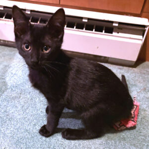 Luna is a spayed female black kitten, born on April 30, 2025. Such a calm girl but purrs so loud. You don’t even need to rub her, and you can hear her as soon as she notices you enter the room. You don’t usually notice her as she likes to do her own thing, but when she wants attention, she will rub up against your leg and make her presence known. Usually, found curled up with one of my younger boys, she’s got a heart of gold. Indoor cat only! Adoption fee is $50. RD-V.