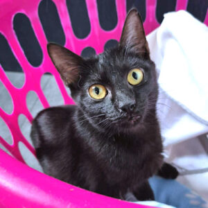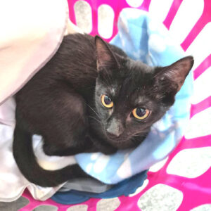 Leo Pittman is a male black kitten, born in July 2025. He has beautiful eyes and a shiny black coat! He has a very outgoing personality, always looking for someone to play with or someone to cuddle with. Indoor cat only! The adoption fee is $50. HIJ
