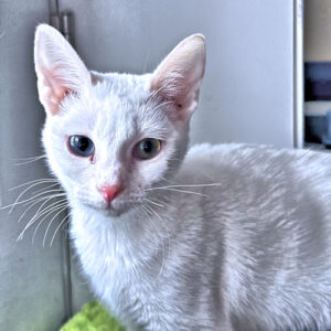 Millie is a spayed female white kitten, born on August 15, 2025. She has heterochromia (one blue eye and one green eye!) and she is fully deaf. Millie is as sweet as can be! She loves to cuddle and play with her toys and other cats!! Due to her disability, she will need to be in a very safe space since she cannot hear predators, other animals, or people approaching such as small children who could startle her easily. She does best with a gentle approach, a soft touch to a paw or a hand brought slowly to her…