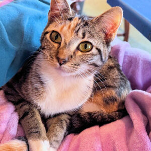 Delilah is a beautiful spayed female dilute tortoiseshell, born on August 1, 2025. She has soft gray and cream markings and the most expressive, soulful eyes. She has a gentle, thoughtful presence and carries herself with quiet confidence—equal parts curious and composed. Delilah enjoys observing the world around her and will happily perch nearby, soaking in all the action before deciding it’s time to join in. She is ready for her forever home, where she’ll thrive with patience, love, and a cozy spot to call her own. Delilah would do wonderfully with someone who appreciates a cat who’s…