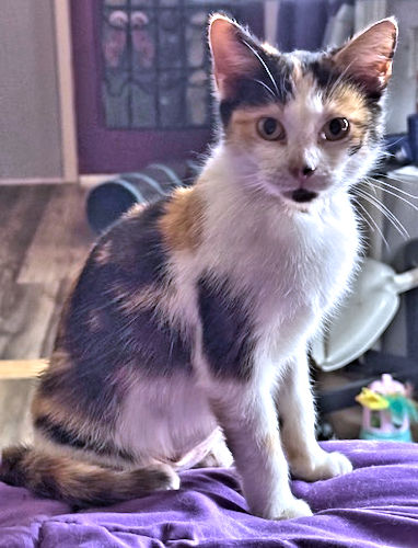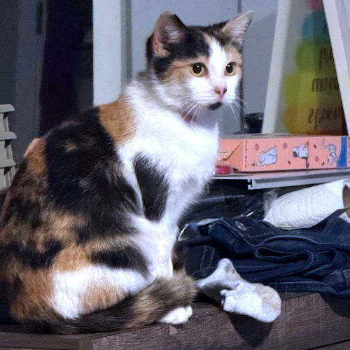Bailey is a spayed female calico cat, born on August 1. 2025. She is very affectionate and loves to be close to her person. She uses the litter box but is not particularly interested in other animals. She does like to play with toys. In door cat only! The adoption fee is $50. CS