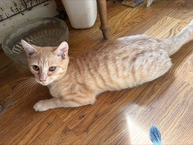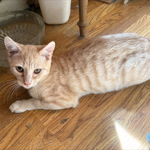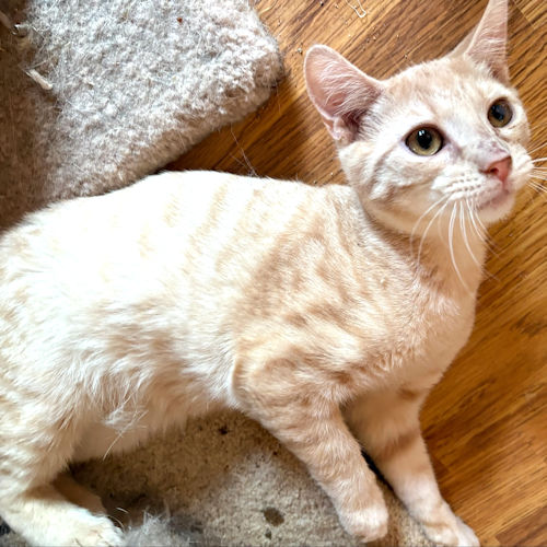 Curly is a neutered male buff-colored tabby, born on October 10, 2025. Curly is up to date on vaccines, ready for his forever home! He wants to be loved and included in the family, but he will probably be shy in his new home when he first gets there. He would love to be adopted with one or both of his brothers – Larry and Moe. They are not as crazy as the Three Stooges, but they are as comical! Indoor cat only! The adoption fee is $50. HIJ