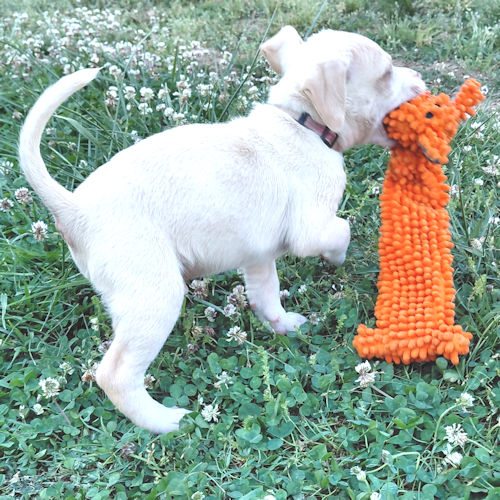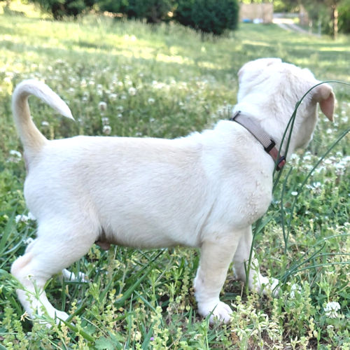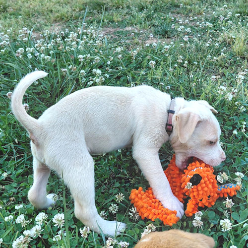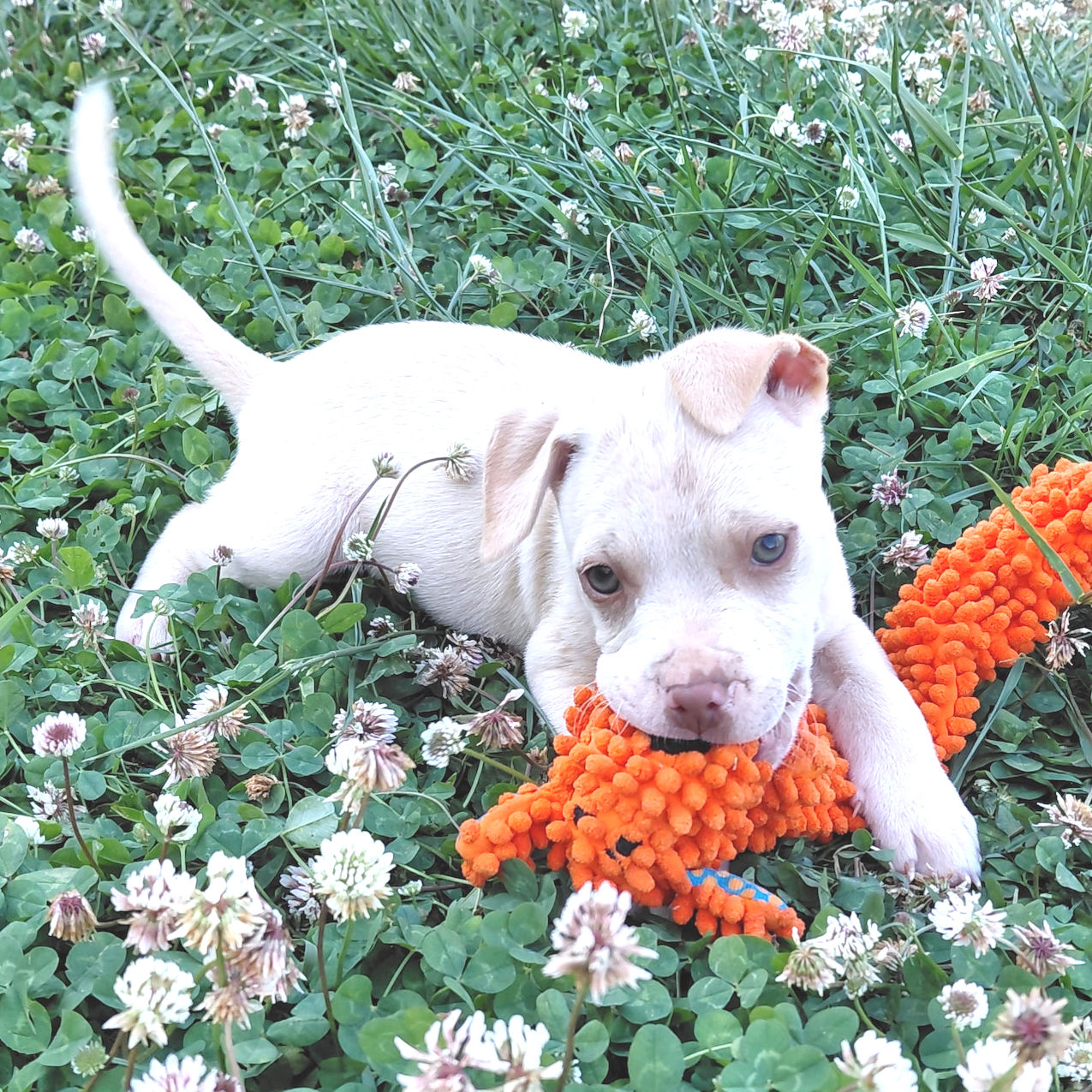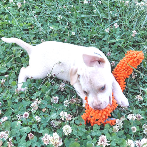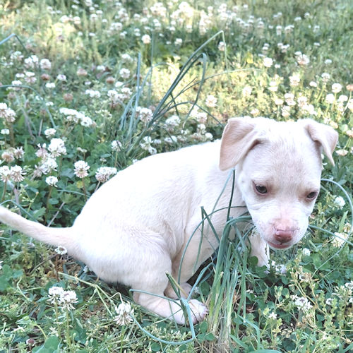 Ghost is a male white bulldog mix puppy, born on February. 15, 2026. Ghost is white and has a small tan ring around his eyes, tan ears, and a tan stripe down his back. He has a pink nose with dark gray around it. He is adorable, playful, with a real love for the food bowl! The adoption fee is $50. LT