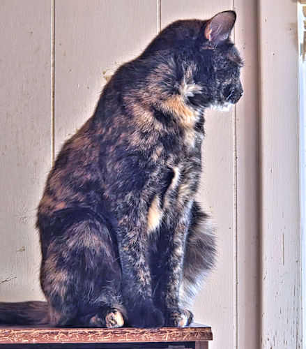 Joyous is loving spayed female tortoiseshell, DOB June 22, 2024. She has a striking elegance about her. Joyous has had to wait a long time to find a family of her own. In the meantime, she is a friendly member of her foster group and gets along well with dogs and cats alike. Indoor cat only! The adoption fee is $25. HIJ