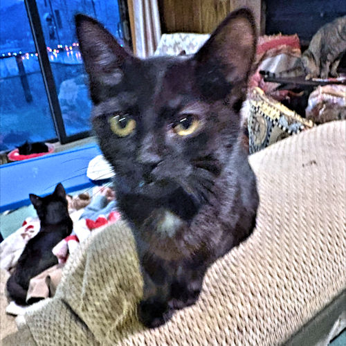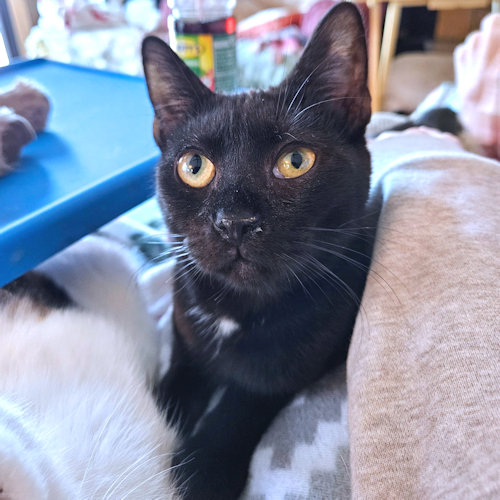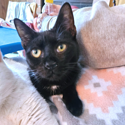 Putt is a neutered male black kitten, born on May 1, 2025. Putt is an unusually outstanding personality!!!! He started off as a 3-week-old kitten under the deck of someone who basically saved his life by taking him in and asking for help. His next step toward the good life was a momma cat named Caddy who was nursing 6-week-old kittens. She saw no problem taking in that demanding little guy and so he started his charmed life. He knows everyone loves him and he gives good love in return. He has not outgrown the habit of making biscuits and nursing the blanket in your lap. He will follow you everywhere and appreciates a ride on your shoulder. Putt will fit into any family. He is easy-going now that he has finally realized he does not need to be rescued. He has it made and he appreciates that. Indoor cat only! The adoption fee is $50. HIJ
