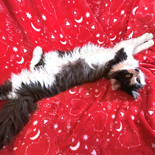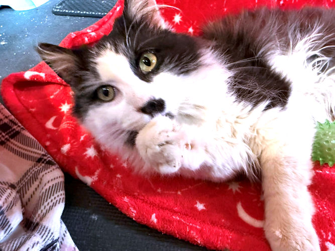 Tommy Boy is a neutered male long-haired black-and-white cat, born on February 10, 2025. Tommy Boy is friendly and affectionate, loves to be petted and sit in a lap. He gets along with friendly cats. He’s playful and curious. Tommy has had a rough go lately and can’t wait to have a home again. Indoor cat only! The adoption fee is $100. VS