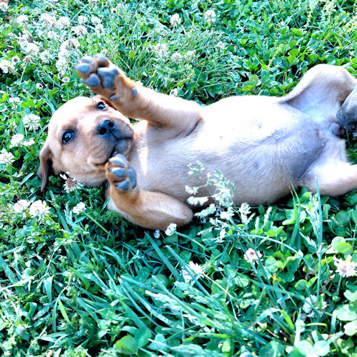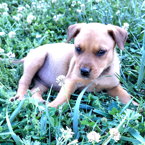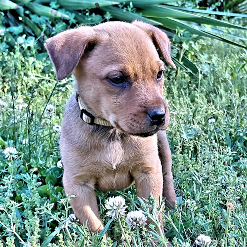 Trinity is a female tan border collie/lab/bulldog mix, born on February 13, 2026. Trinity is tan, with dark ears and a dark stipe down her back. So playful!!! She is a beautiful two-tone caramel color, very lovable snuggly with that wonderful puppy energy. When there is no one else to play with, she finds something to play with, like a piece of wood. Adorable! The adoption fee is $150. LT